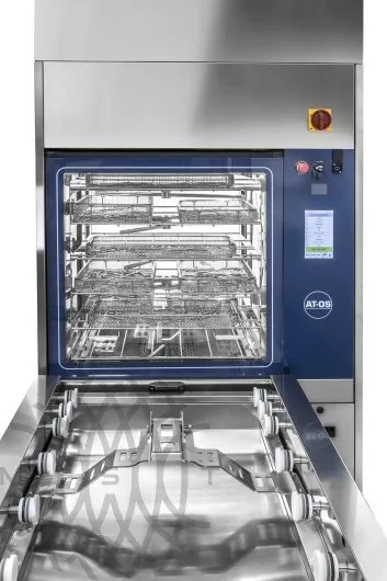 Моечная машина AT-OS AWD655-15A высокой загрузки для дезинфекции инструментов и вспомогательных медизделий. Автоматическая слайдовая дверь на 15 корзин стандарта DIN ~ 450 литров.