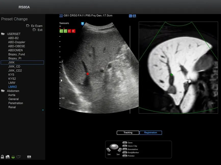 - S-Fusion - программа, позволяющая одновременную визуализацию участков печени, полученную при помощи ультразвукового исследования и данные КТ или МРТ автоматически на одном экране и в разных режимах (в том числе в режиме реального времени) с помощью специальных магнитных сенсоров на датчике